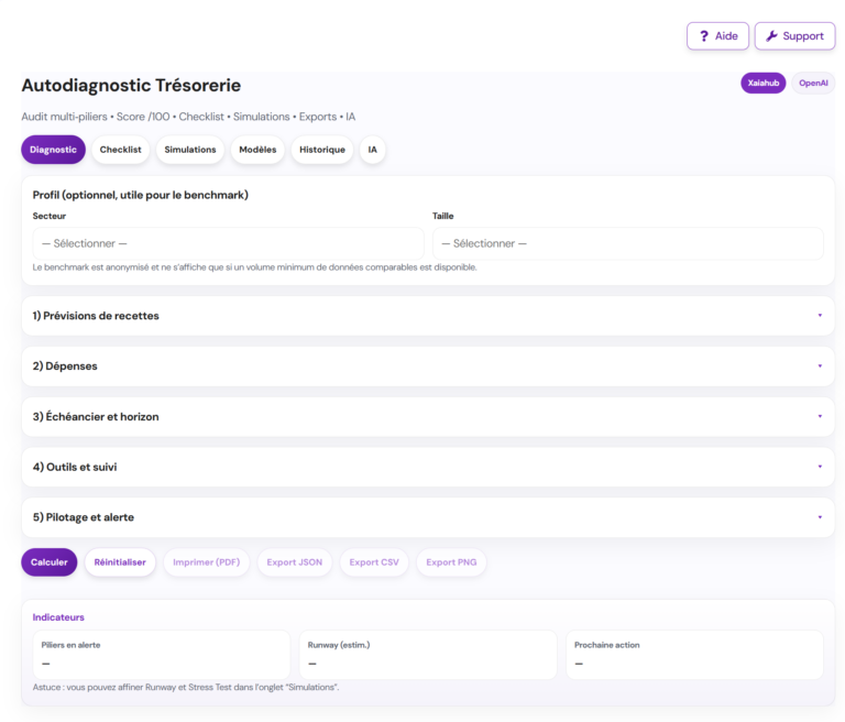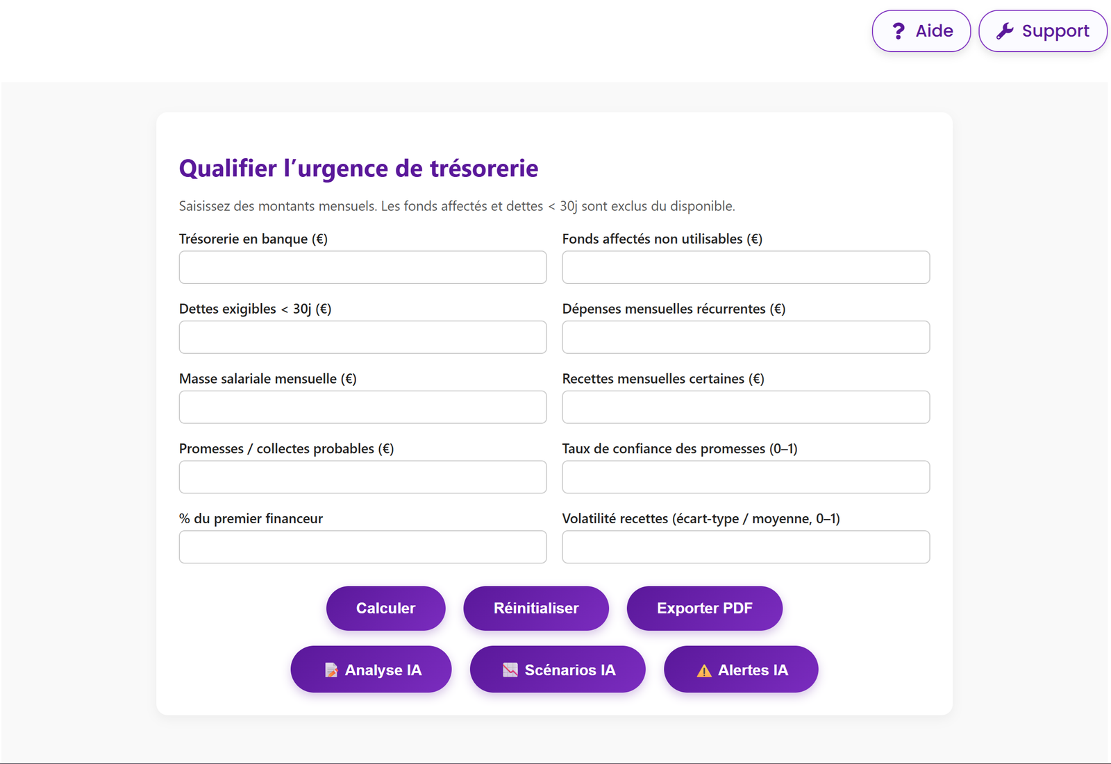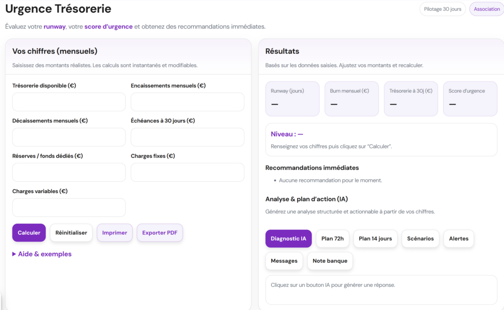 Identifiez vos urgences de trésorerie en 5 minutes, suivez des actions concrètes et mesurables, puis partagez un rapport clair avec votre gouvernance.