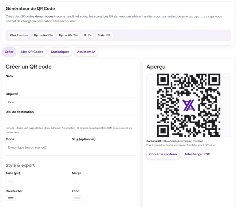 Tout ce qu’une association attend d’un QR code… en beaucoup plus utile. Ce n’est pas “juste un QR”. C’est un outil de campagne : création, branding, pilotage, optimisation.