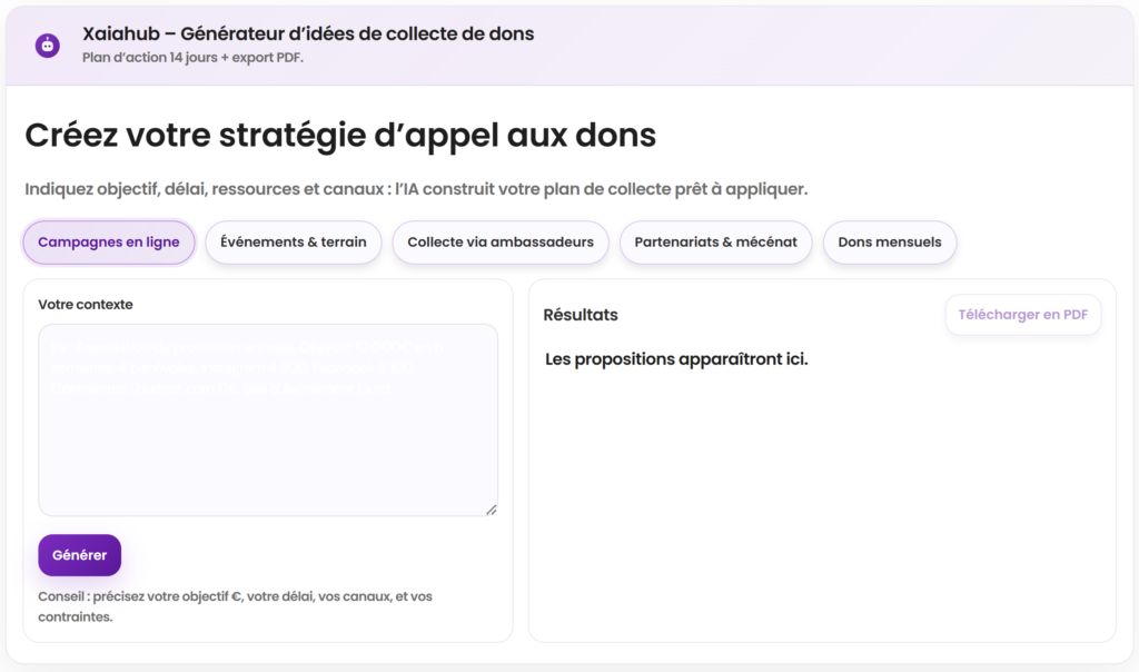 Pas besoin d’être expert. Xaiahub adapte automatiquement l’analyse et génère un plan d’action prêt à appliquer.